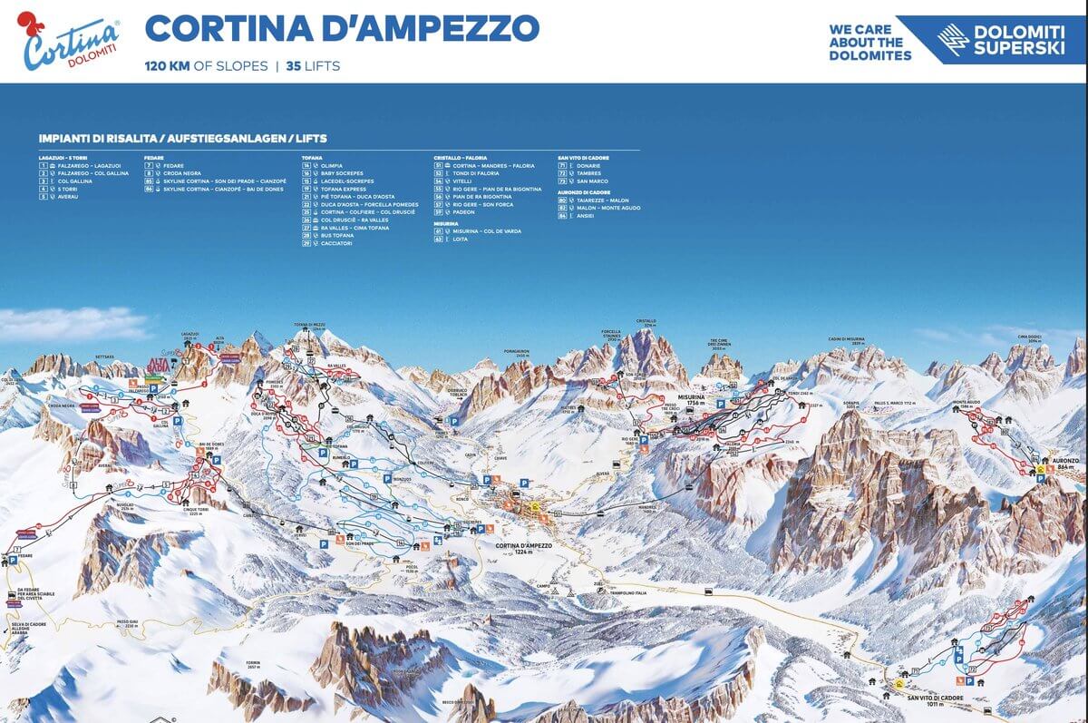 Официальную карту трасс Cortina d’Ampezzo можно скачать в PDF на сайте Dolomiti Superski: