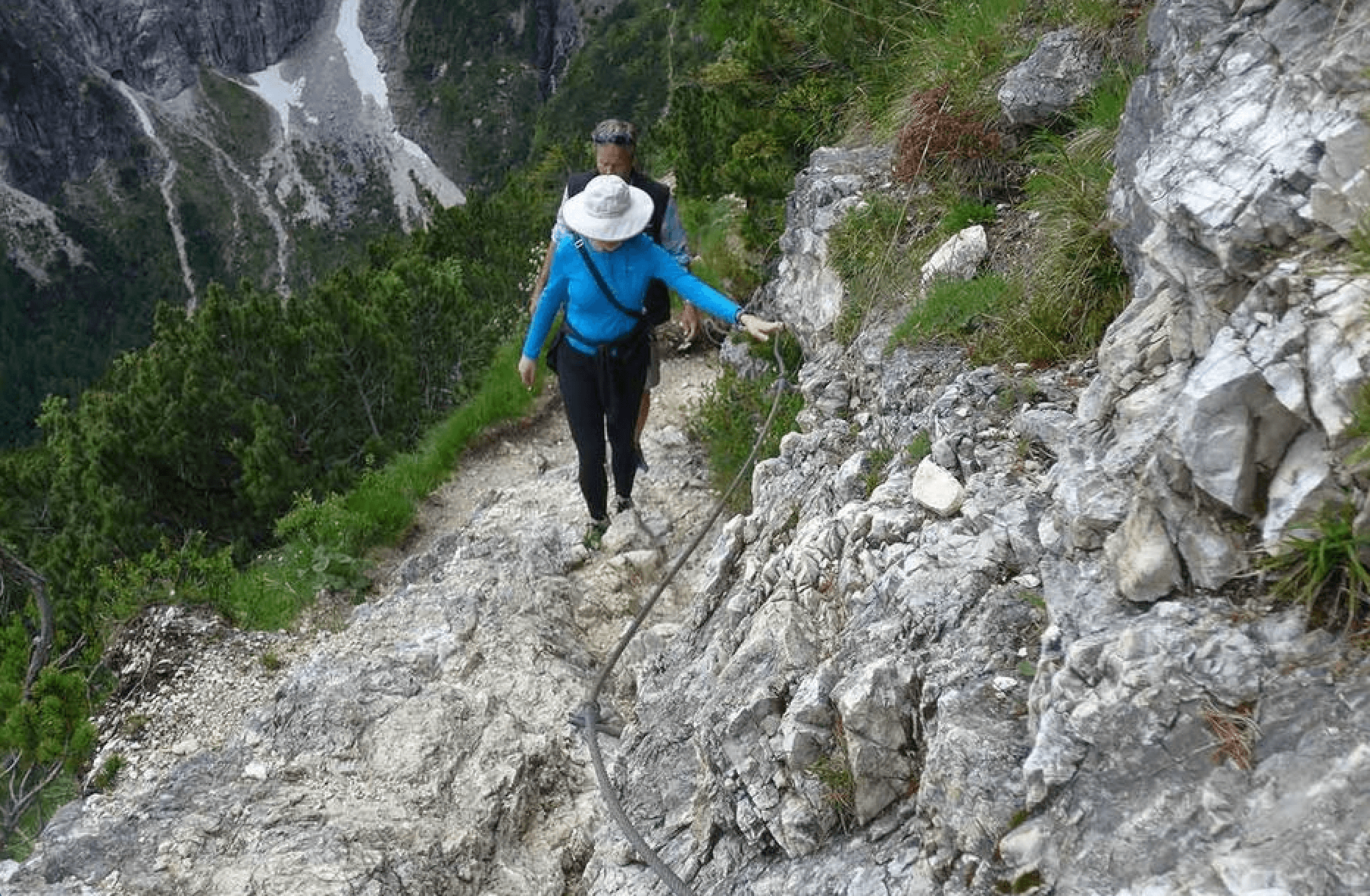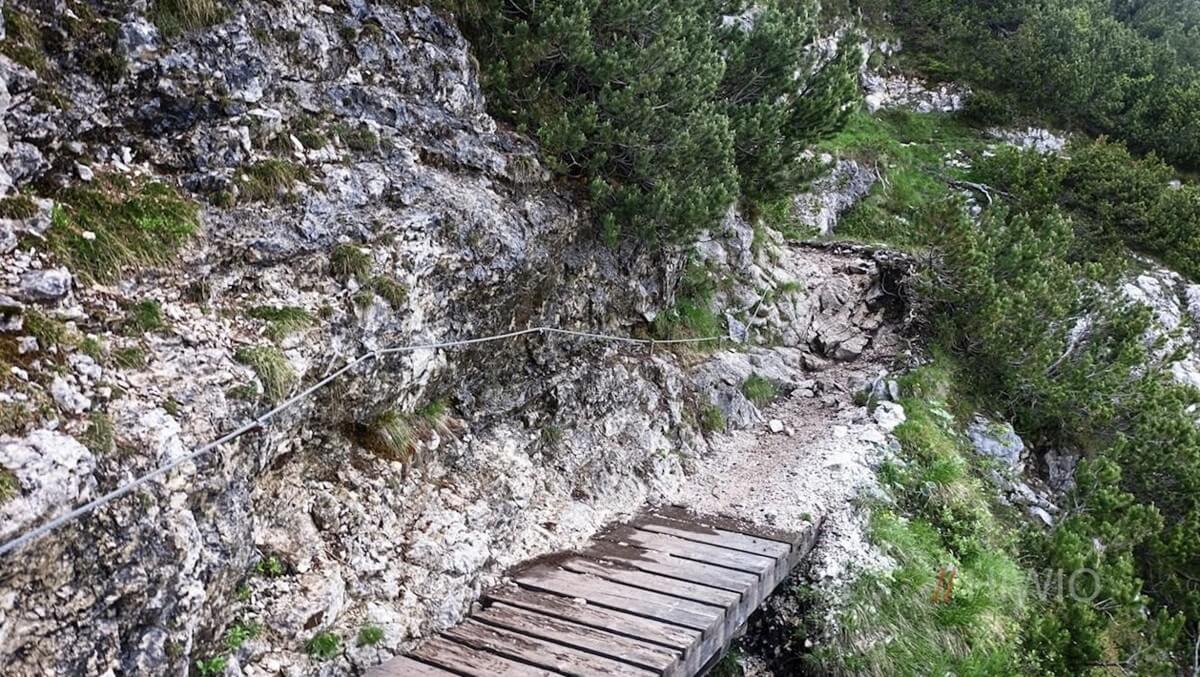 Самые сложные места — это участки вдоль скал. Здесь тропа проходит по склону, местами с обрывами, и оборудована металлическими тросами.