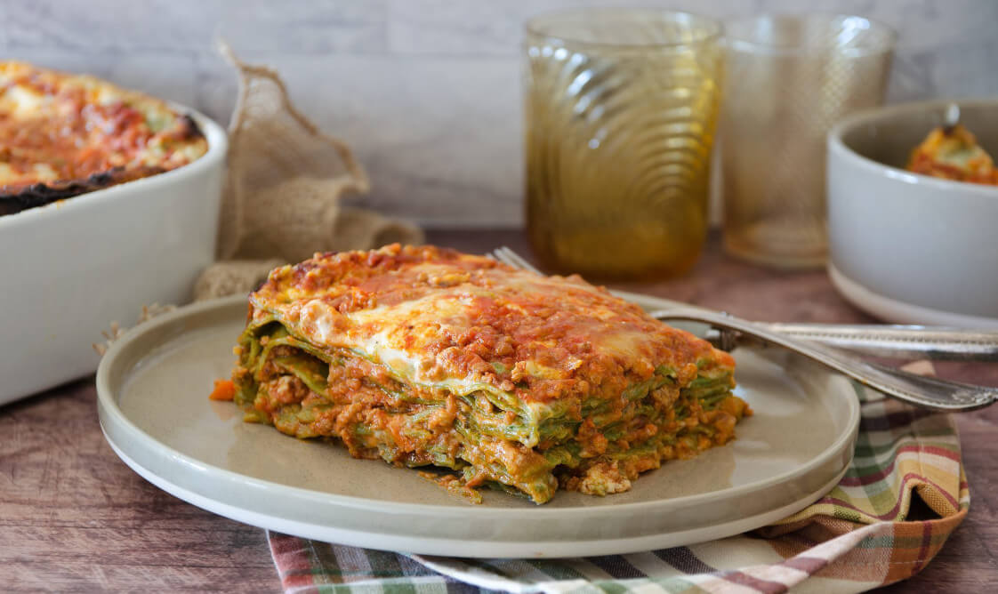 Зелёные шпинатные листы лазаньи подаются с рагу болоньезе и соусом бешамель. Мягкое и очень насыщенное блюдо.